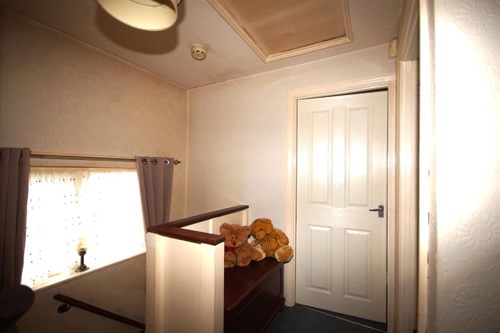 GROUND FLOOR CLOAKROOM: (3’4 x 5’) With double glazed uPVC frosted window to side, low flush close coupled w.c. wash hand basin with mixer tap, radiator, tiled floor to match kitchen and fully tiled walls, coving and two inset ceiling lights. Panelled door to Utility Room.FIRST FLOORLANDING: Circular window to side with leaded and stained glass, handrail, newel post and balustrading. Stripped, timber panelled doors to all rooms, access hatch to loft space and pendant light. Page Three
