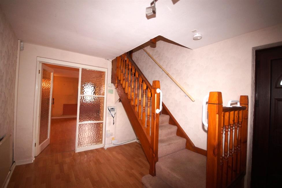 PORCH: (12’8 x 3’6) Windows to front and side, front door opening inwards to –HALL: (11’10 x 8’9 ) Double glazed uPVC window to front, with fitted venetian blind, laminated floor, one radiator, staircase to first floor with two newel posts, handrails and balustrades, uPVC double glazed side window and ceiling light fitting. Door and side screen to –