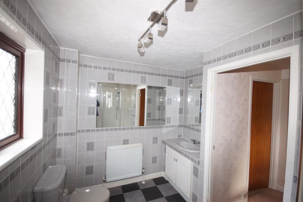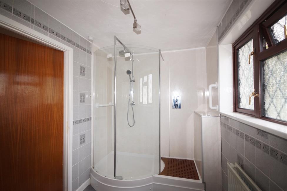 FIRST FLOORLANDING: (9’9 x 6’7) Two newel posts, handrail and balustrading, uPVC double glazed frosted window to side, four spot ceiling light fitting, one radiator, built-in airing cupboard (2’ x 3’5) with hot water tank, slatted shelving and central heating controls. REAR BEDROOM ONE: (12’9 x 11’10) Double glazed uPVC window to rear, curtain track above and one radiator under. Extensive range of fitted wardrobes with hanging rails and shelving and four spot ceiling light fitting. REAR BEDROOM TWO: (15’1 x 10’) Double glazed uPVC window to rear, one radiator under, four spot ceiling light fitting and access hatch to loft space.FRONT BEDROOM THREE: (11’9 x 8’8) Double glazed uPVC window to front, fitted venetian blind, one radiator under and two double fitted wardrobes. SHOWER ROOM: (7’7 x 10’0) Modern suite comprising low flush close coupled w.c. wash hand basin set in its own vanity unit with cupboard under, large walk-in shower with timber draining, step and mains shower with hand held spray and overhead drencher, mock tile laminated floor, two radiators, fully tiled walls, inset wall mirrors, four spot ceiling light fitting and shower boarding to shower area.