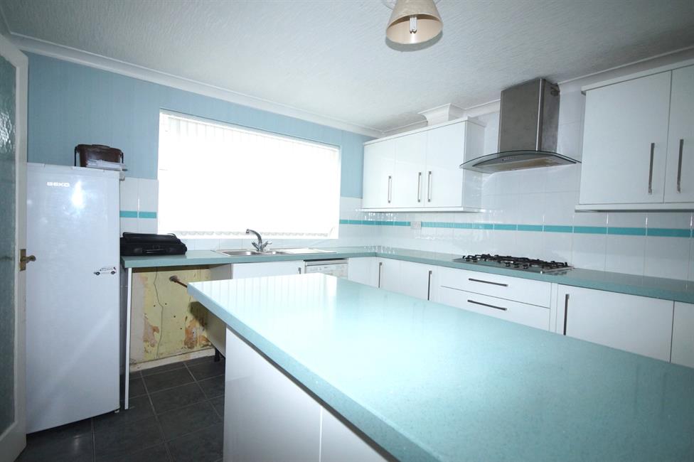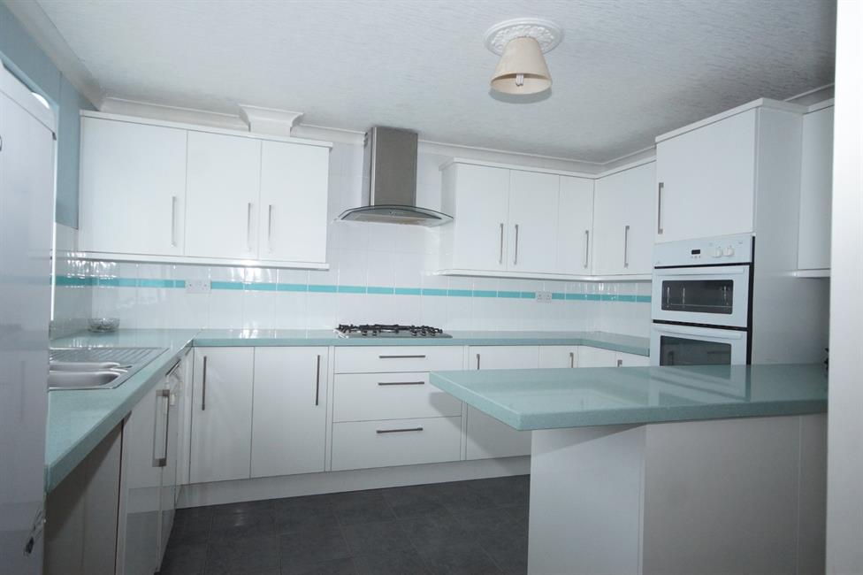 KITCHEN: (11’9 x 10’8) Double glazed uPVC window to front, fitted vertical blind, ceramic tiled floor. Range of fitted units comprising, cupboards, drawers and work surfaces, built-in five ring gas hob, separate double oven, one and half bowl sink unit, spaces for washing machine, fridge/freezer and dishwasher, part wall tiling, overhead cooker extractor and ceiling light fitting.