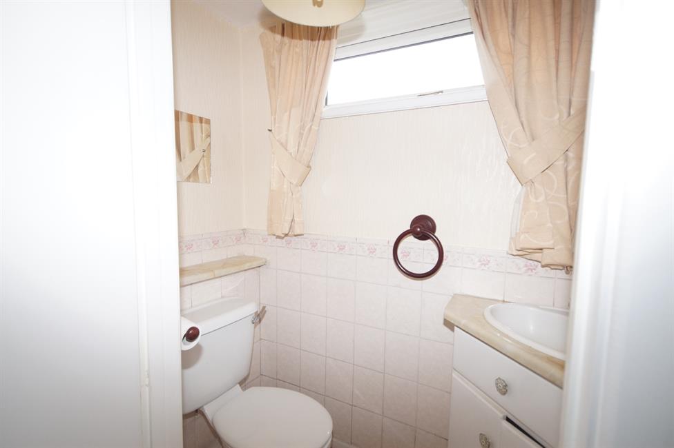 GROUND FLOOR CLOAKROOM: (3’ x 5’6) Low flush close coupled w.c. wash basin with vanity unit, frosted window to front, fuse box, part tiled walls, door to hall.
