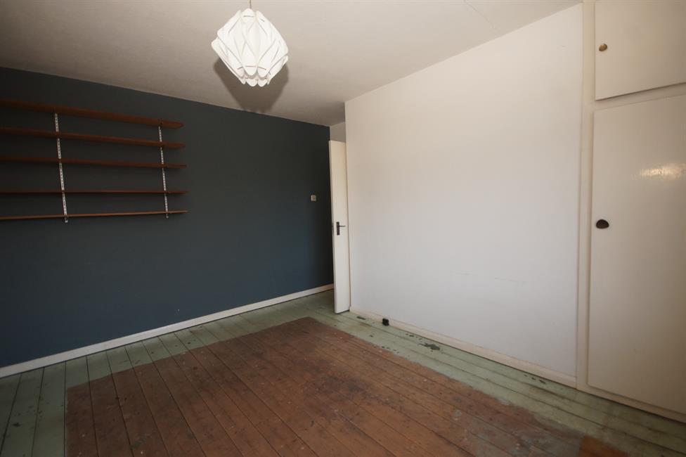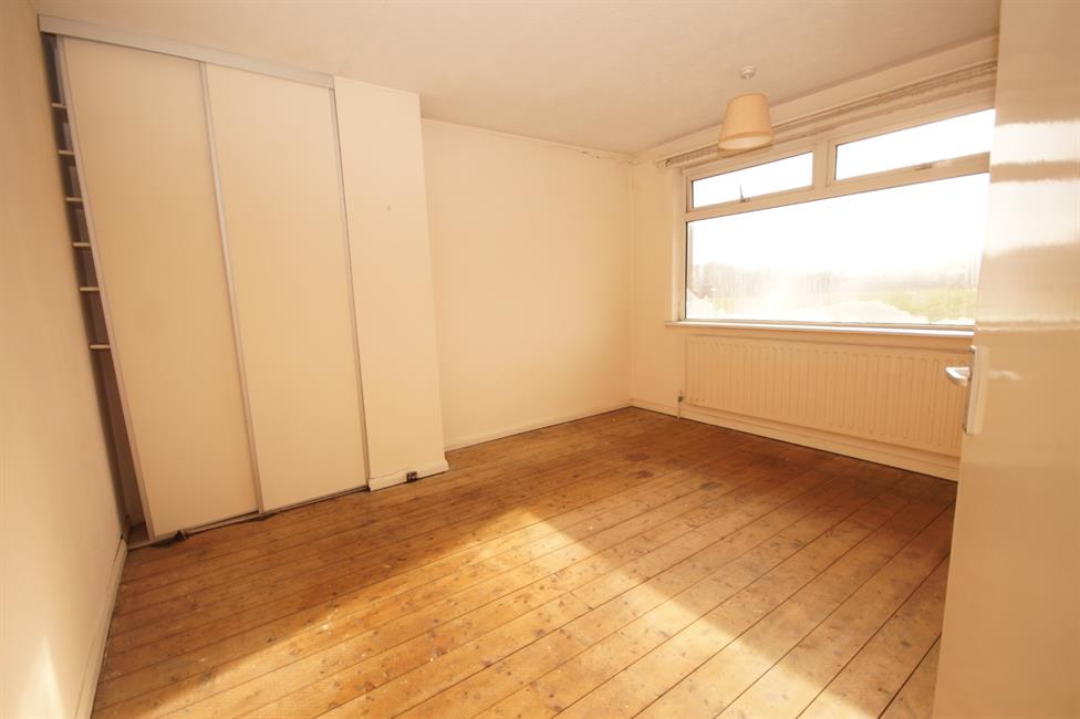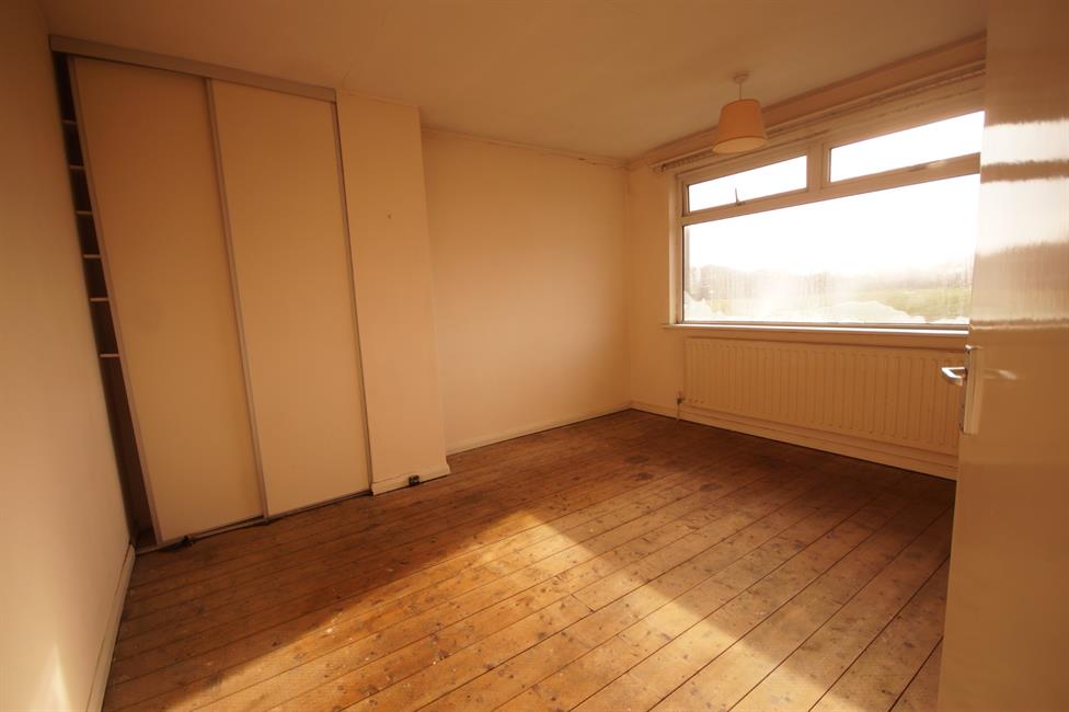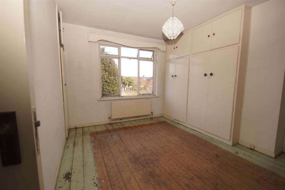 FRONT BEDROOM ONE: (12’11 x 11’1) Double glazed window overlooking Heath Park, radiator under, built-in wardrobe in corner and pendant light.