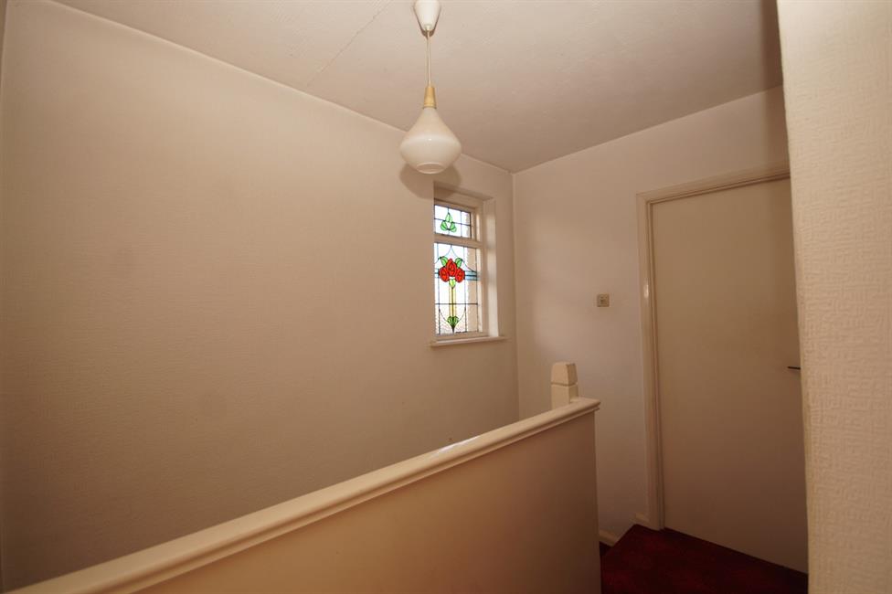 FIRST FLOORLANDING: Original stained glass window to side, built-in airing cupboard and loft hatch.